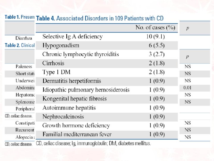 GİS Dışı Belirtiler Anemi (Fe, B 12, FA) Boy kısalığı Ağızda aft-ülser Transaminaz Diş mine boz. Nörolojik bulgular (ataksi, epilepsi, periferik nöropati) Osteopeni/osteoporoz, kırık DH, psöriazis, vitiligo, AA Artralji Pubertede gecikme, amenore