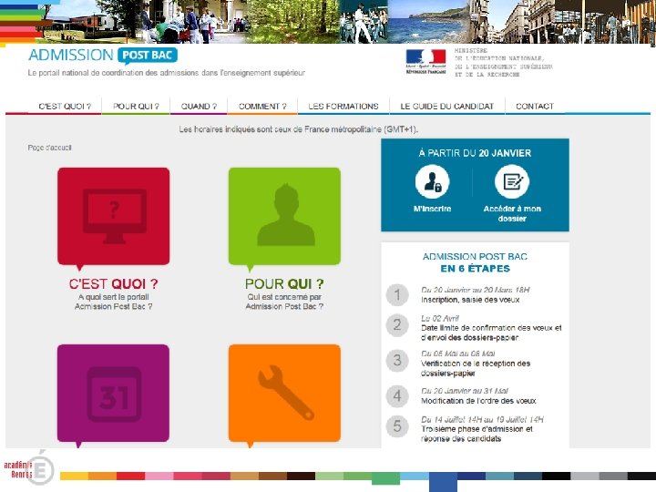 Pour l’élève : les 4 grandes étapes de la procédure d’admission 3ème étape. 1ère étape. Pour cette année : Saisie des vœux sur le portail du 20 janvier au Propositions les 8 et 23 juin, 20 mars (classement des vœux et 14 juillet et réponses du 20 janvier au 31 mai) candidats sous 72 heures. 2ème étape. Constitution et envoi des dossiers de candidatures (variable suivant les EPLE d’accueil) 2 avril. 4ème étape. Inscription ou procédure complémentaire à partir de fin juin. 29