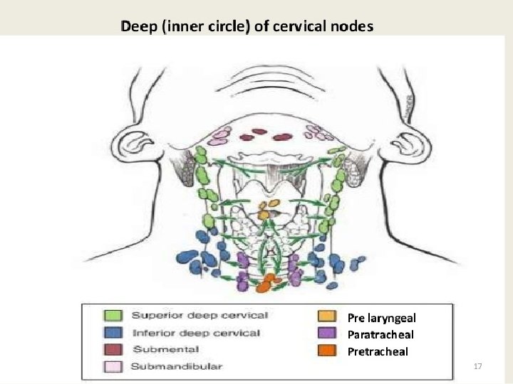 Submental (2 -3) Submental triangle Drain the: Medial part of lower lip Lower incisor teeth and gingiva Tip of tongue Cheeks Efferent: Submandibular lymph node jugulo-omohyoid lymph node and superior deep cervical lymph nodes