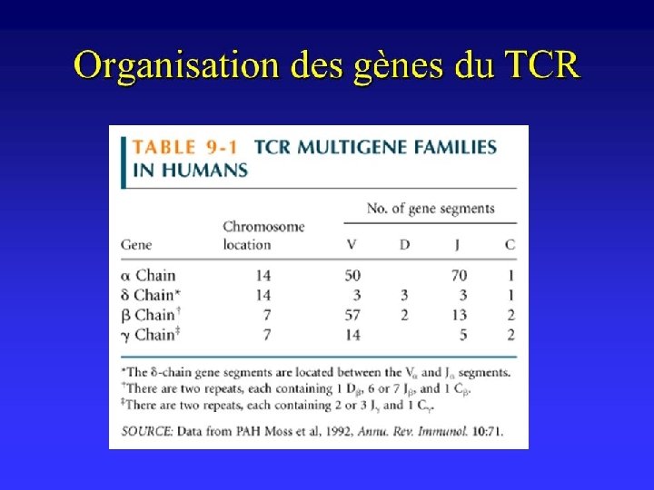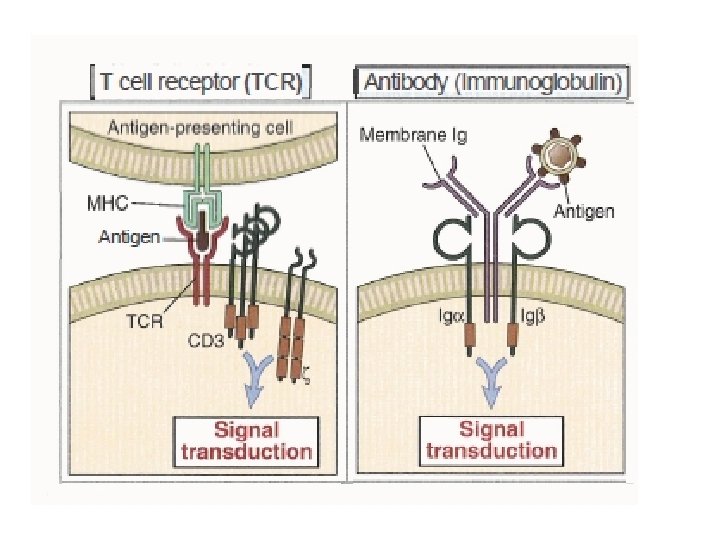 αß TCR • 90% of TCR is αß • TCR complex is the αß receptor plus the ζ chain and two CD 3 signaling proteins • Each chain constitute of one variable, one constant, hinge, transmembrane and cytoplasmic tail • covalently linked to each other by a disulfide bridge between extracellular cysteine residues • TCR that specifically recognizes peptide-MHC complexes • Hypervariable regions on both Vα and Vß are the same as those of antibody located on Ag-binding site and called CDR and they are 3 sites for each