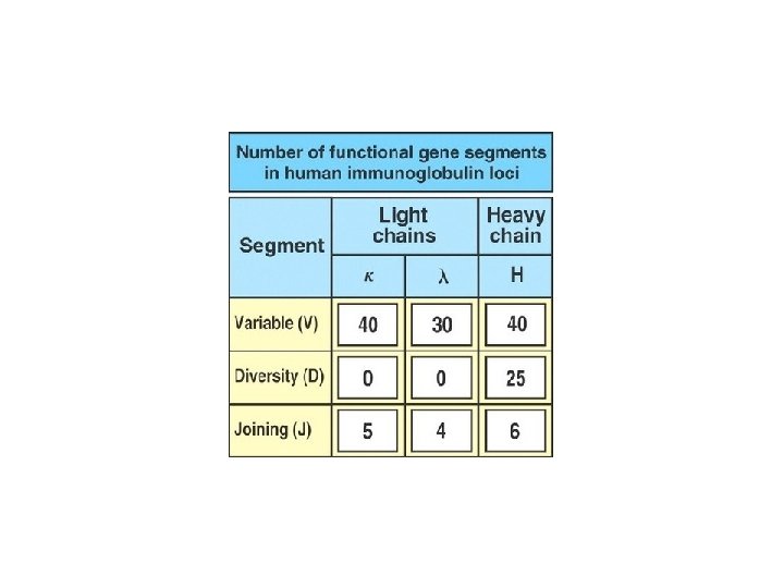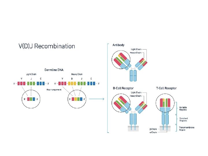 T & B Receptor formation or somatic recombination The T and B cell receptor gene segments are -V for variable, -D for diversity, - J for joining, - C for constant, for BCR two types (kappa and lambda) light chain and 5 for heavy chain (Cϒ for IGG, Cδ for IGD, Cε for IGE, Cμ for IGM and Cα for IGA). For TCR one for alpha and 2 for bet chain - V-D-J To make variable parts of BCR heavy chain and TCR Beta chain - V-J to make variable parts of BCR light chain and TCR alpha chain - Enzyme used to make these combinations is RAG enzymes. RAG-1 and RAG-2 are proteins at the ends of VDJ genes that separate, shuffle, and rejoin the VDJ genes - Joining the constant segment - (C μ for heavy chain of BCR then C lambda or kappa for BCR light chain - and C β then C alpha for TCR – Complete receptor formed on immature T & B cells