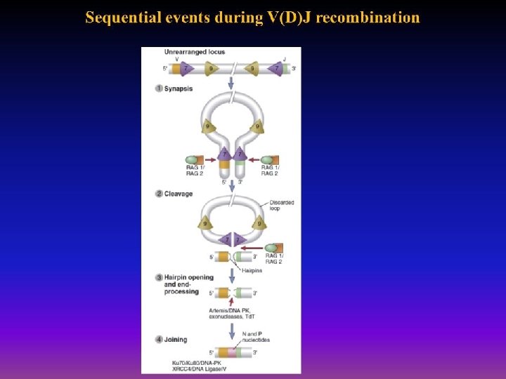 somatic recombination q DNA Recombination include – Synapse, making chromosomal loop – Cleavage by RAG enzyme – Hairpin opening and end-processing(addition or removal of bases) mediated by Artemis endonuclease, – Joining (Ligase) q Variability in binding sites Because of • Combinatorial diversity. rearrangement brings together multiple germline gene segments that may combine randomly, and different combinations produce different antigen receptors. • J gene segments in the TCRα and beta and immunoglobulin light and heavy –chain. This region encodes the CDR 3 loops in immunoglobulins and T-cell receptors that form the center of the antigen-binding site