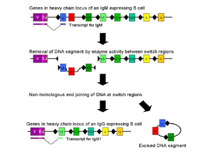 TCR and BCR In peripheral LN • The recombination process that creates diversity in BCR and TCR in peripheral LN is unique to that during the early stages of their development in primary lymphoid organs • T cell receptor revision (antigen receptor editing) is a process in the peripheral immune system which is used by mature T cells to alter their original antigenic specificity based on antigen. • In B cells in the lymph nodes, Activation-induced cytidine deaminase causes mutations that produce antibody diversity – Somatic hypermutation, in which the antibody genes are minimally mutated to generate antibody with higher affinity for a particular antigen than any of its close variants – Class switch recombination, in which B cells change their expression from Ig. M to Ig. G or other immune types