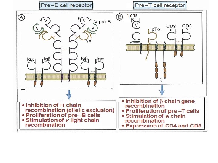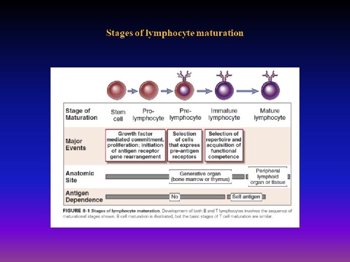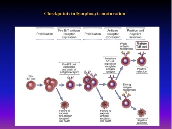 • Pre- cells proliferate in response to signal transduction from formed receptor • Fourth; Selection events that preserve cells that have produced functional antigen receptor proteins and eliminate potentially dangerous cells that strongly recognize self antigens, cells that remain after selection called mature cells. • Fifth; Differentiation of mature B and T cells into functionally and phenotypically distinct subpopulations. B cells ( B-2 cells) develop into follicular (majority), marginal zone. in BM, and T cells develop into CD 4+ and CD 8+ αβ T lymphocytes in thymus. Then cells transported to peripheral LN. fetal liver stem cells give rise to B-1 cells