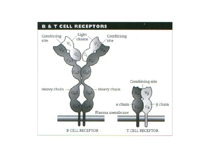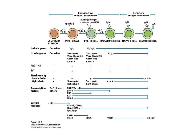 B cells • Pro-B cells; the earliest stage in BM • Ag receptor expression is the first key to lymphocyte survival; • Early: a single chain receptor (Ig. H (the 2 IGM heavy chains with surrogate light chains and immunoglobulin alpha and beta) = pre-B cells; • Later: completed Ag receptors formed by formation of light chains kappa type, if fail use lambda light chain Light chain contain just V-J segments immature B cells = complete IGM BCR
