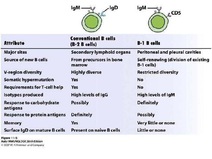 B 1 cells (CD 5+ B cells) • B-1 cells 5 -10% of blood B cells naturally found from fetal life, produce IGM, natural antibody present without immunization. has limited diversity give rapid antibody production against microbe. Act against carbohydrates, do not do isotype switch or do affinity maturation, no need to T cell help, and self renewing, present in the peritoneum and in mucosal sites. • Marginal zone B cells are a distinct population of B cells that mainly respond to polysaccharides. After activation, these cells differentiate into short-lived plasma cells that produce mainly Ig. M.