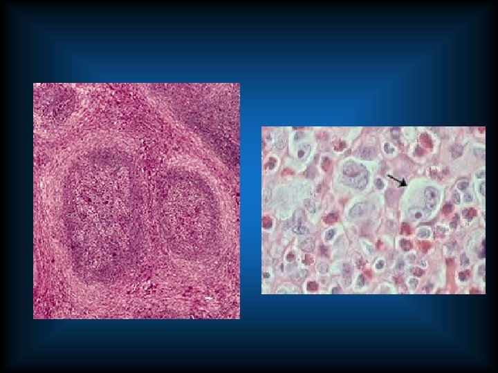 Reed Sternberg Cell • “owl’s eye” • 2 nuclear lobes with large inclusion like nucleoli (eosinophilic) • Clear halo around nucleolus (chromatin condensed to nuclear membrane) • Abundant cytoplasm – Lymphocytic and Histiocytic Cell • “popcorn cell” • Polylobated nucleus • Lack of prominent eosinophilic nucleoli • Lack of halo