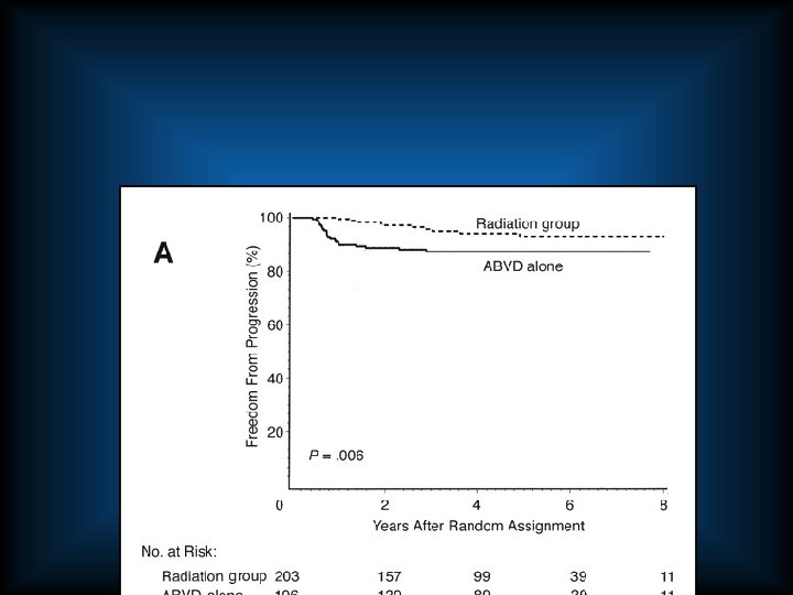 Newer Regimens • Stanford V – Weekly chemotherapy for 12 weeks with post radiation for bulk (> 5 cm) – 6. 9 yr follow up • Freedom form progression – 91% • Overall survival – 95% – RCT Stanford V vs ABVD ongoing