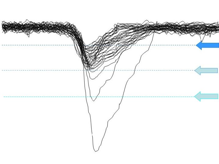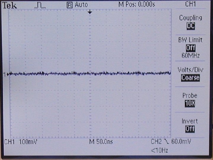 Try to confirm your selection by eye, with an oscilloscope, adjusting it’s own trigger threshold. A very low threshold will have the oscilloscope almost continuously triggering, revealing a band of noise. Moving the threshold just far enough to kill the noise and give only the flickering images of healthy signals can give you an approximate idea of where threshold should be set. Note: the DAQ card has a built-in x 2 amplifier, so uses thresholds twice the size of the ones you'll need to set for the oscilloscope trigger. (i. e. , a threshold of 65 m. V from the DAQcard scan corresponds to a 32 m. V trigger threshold on the oscilloscope).