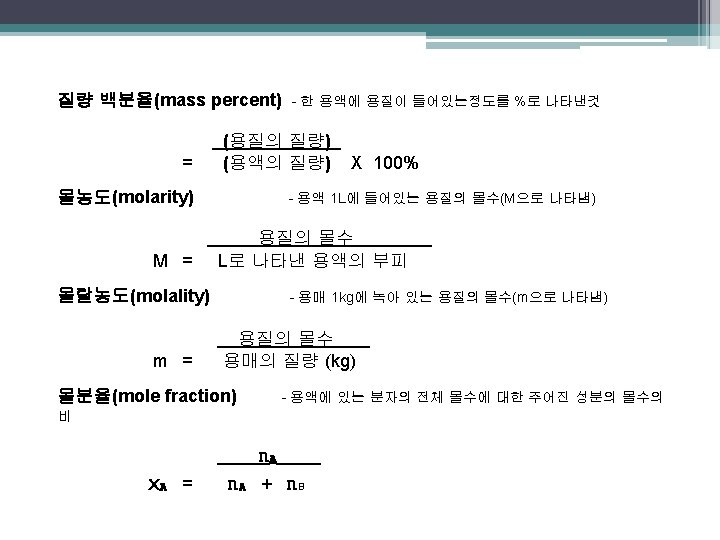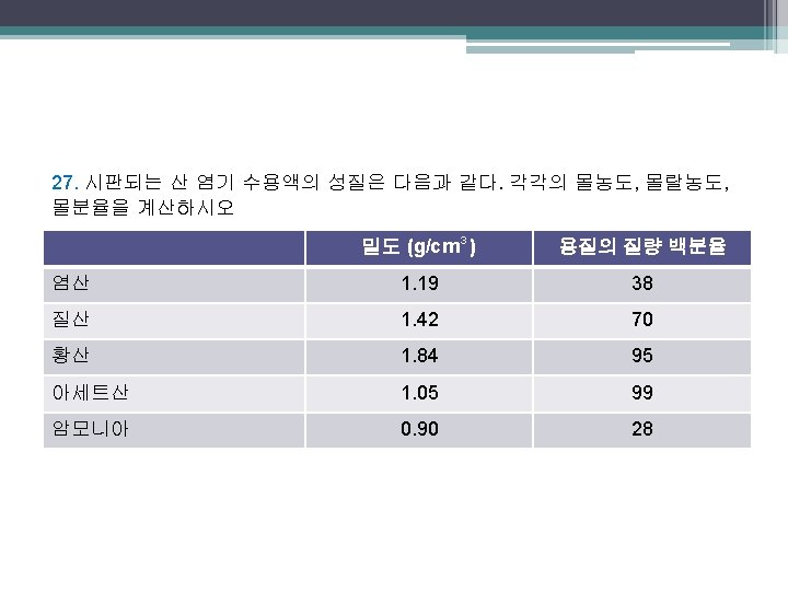 암모니아 28 g NH 3 M= 100. g 용액 m= 28 g NH 3 72 g 용매 28 g NH 3 X 72 g H 2 O x NH 3 = 1 mol NH 3 1000 cm 3 0. 90 g 용액 X X X 17. 03 g L cm 3 용액 . . . 1000 g kg X . . X 1 mol NH 3 17. 03 g 1 mol = 1. 6 mol NH 3 17. 03 g. X 1 mol = 4. 0 mol H 2 O 18. 02 g. 1. 6 = 0. 29 4. 0 + 1. 6. = 23 mol/kg = 15 mol/L