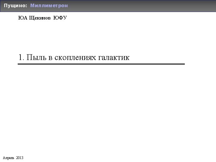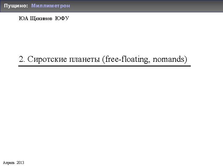 M 81 Xilouris etal 2008 Leo M 96 Slides: 18 Download presentation Группа M 81 Xilouris etal 2008 Облако Leo в группе M 96 Bot etal 2009 Spitzer Destruction Polikarpova & Yu. S 2013 Скопление Virgo: сегодня Baes etal 2010 Herschel: FIR от M 87 в скоплении Virgo Grossi etal 2010 Herschel: FIR от карликовых галактик в Virgo OGLE – Optical Gravitational Lensing Experiment Старые планетные системы 2011 Galactic bulge free-floating planets (nomands) Планеты-сироты (free-floating planets) Delorme etal. 2012 ESO-NTT NIR follow up 0. 8 – 2. 3 μm Nomands Old free-floating planets (nomands) Очень старые сироты Ancient Nomands Yu. S, Safonova & Murthy 2013 in prep