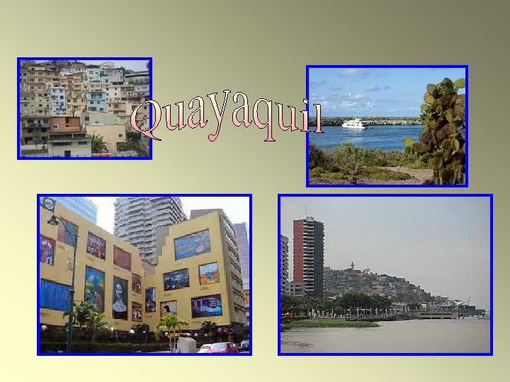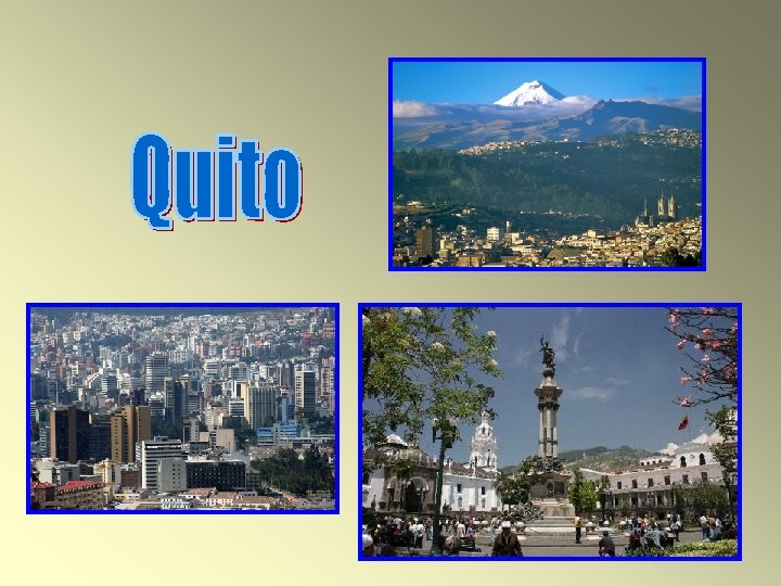 EKVÁDOR Hlavné mesto: Quito (1, 5 mil. obyv. ) ♠ názov podľa rovníka zo španielčiny ♠ patria mu Galapágy (sopečné ostrovy- korytnačky slonie) ♠ Východná a Západná Kordillera - medzi nimi plošina, Cotopaxi, východ - Amazonska nížina ♠ ťažba ropy - polovica príjmov z vývozu (olova, striebra, zlata, medi), medi ♠ základ hospodárstva - poľnohospodárstvo: banány, káva, kakao, cukrová trstina - export ♠ významný rybolov - tuniaky, sardinky Je jedna z hospodársky najslabšie rozvinutých krajín Južnej Ameriky Najúrodnejšie a súčasne najhustejšie zaľudnené sú oblasti náhorných plošín Potravinársky priemysel sa sústreďuje do hlavného mesta Quito a najväčšieho mesta štátu Guayaquil