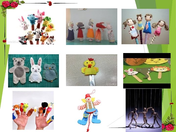 Chủ đề 2: Tạo hình con rối và sân khấu biểu diễn rối Tiết 1: Tạo hình con rối 1. Tìm hiểu Quan sát một số hình ảnh sau đây, thảo luận về: + Loại hình rối ? + Chất liệu để làm rối ? + Cách biểu diễn ?