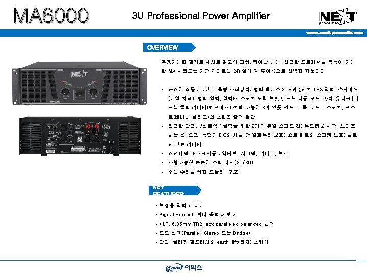MA 6000 3 U Professional Power Amplifier www. next-proaudio. com Specifications MODEL POWER (STEREO) POWER (BRIDGE) MA 6000 8Ω 2 x 1400 W 4Ω 2 x 2100 W 2Ω 2 x 3000 W 8Ω 4200 W 4Ω 6000 W FREQ. RESPONSE(Half Power) 15 Hz - 25 k. Hz (+0 / -1 d. B) THD+NOISE AT 1 k. Hz(Half Power) <0. 025% IMD(60 Hz and 7 k. Hz, 4: 1) <0. 04% SIGNAL TO NOISE RATIO(SNR) >105 d. B SLEW RATE(Input Filter Limit. ) 40 V/μs DAMPING FACTOR(1 k. Hz at 8Ω) >400: 1 INPUT SENSITIVITY Selectable (0. 77 V / 1. 0 V / 1. 44 V) INPUT IMPEDANCE 10 k Ω balanced to ground INPUT CONNECTORS Female & Male XLR-3 OUTPUT CIRCUITRY Class H OUTPUT CONNECTORS 4 pole Speakon and binding posts PROTECTIONS Full short circuit, open circuit, thermal, soft start, DC, Sub/Ultrasonic and RF LED INDICATORS(Per Channel) Active, signal, limit, protect PANEL CONTROLS Front: 2 input attenuators | Rear: Ground lift, mode selection, compressor COOLING Front to back via 2 variable speed fans POWER REQUIREMENETS 230 VAC, 50 Hz-60 Hz (others by request) DIMENSIONS (Wx. Hx. D) 483 x 132 x 471 mm WEIGHT 35 kg