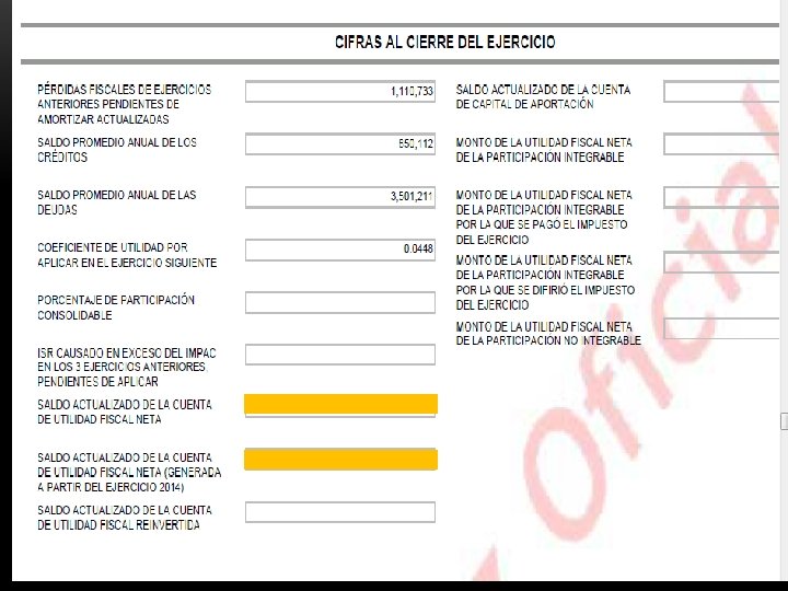 Declaración Anual DEM - Datos informativos • Utilidad fiscal 2013 $ 400, 000 • Utilidad fiscal 2014 $ 600, 000 • Utilidad fiscal 2015 $ 300, 000 • Perdida fiscal 2016 $ 1, 000 Saldo CUFIN $ 1, 300, 000 Gastos no deducibles fracciones 32 Saldo CUFIN 800, 000 Art. 28 $ 500, 000 Y lo sabe el socio o