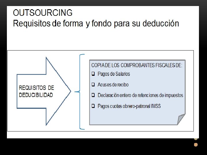 El outsourcing legal • Contrato de prestación de servicios • Quien es el Patrón y el responsable seguridad social • Manual de indicadores • Manual del perfil • Bitácora de trabajo • Avance del trabajo LA • Relación de trabajadores MATERIALIZACION • Liquidación del servicios DE LOS HECHOS