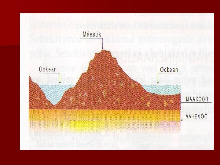 MAAKOOR (2) n Maakoorest on moodustunud • mandrid • ookeanid n Mandrite all on maakoor paksem kui ookeanide all n Maakoore paksus • mandrite all on keskmiselt 40 km • ookeanide all 5 km • mäestikes kuni 90 km
