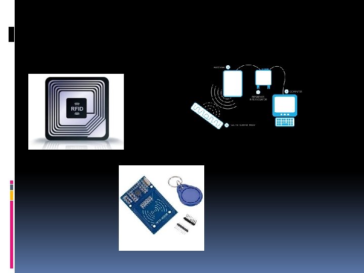 Chiave elettronica tramite RFID: Radio Frequency IDentification Dispositivi basati sulla emissione di onde elettromagnetiche nel vuoto per identificare oggetti o persone o animali anche in movimento Esistono diversi tipi di RFID passivi: RFID passivo LF (125 -135 KHz): utilizzabile worldwide con distanza di lettura limitata ed applicata per antifurti, chiavi, etc. RFID passivo HF (13, 56 MHz), normalizzata dagli standard ISO 14443 e ISO 15693; è utilizzata worldwide, con distanza di lettura ridotta fino a 1, 20 mt. ed applicata per libri, pallet, controllo accessi, abbigliamento etc. RFID passivo UHF (868 -915 MHz): incontra limiti locali definiti dalle autorità dei singoli paesi, applicata per pallet, container, etc. VHF (2, 4 o 5, 8 GHz): utilizzata globalmente per transponder attivi, applicata per controllo accessi, veicoli, etc. Gli RFID attivi sono dotati di alimentazione propria fornita da una batteria a lunga durata; quando interrogati dal sistema di lettura, detti tag emettono una propria energia in radio-frequenza in grado di propagarsi su distanze più consistenti; utilizzando l’avanzata tecnologia di trasmissione radio nella banda UHF, gli apparati RFID Attivi trasmettono e ricevono dati a distanze fino a 100 metri (Tag i-B 2) o fino a 500 metri con tag della famiglia i-Q 350.