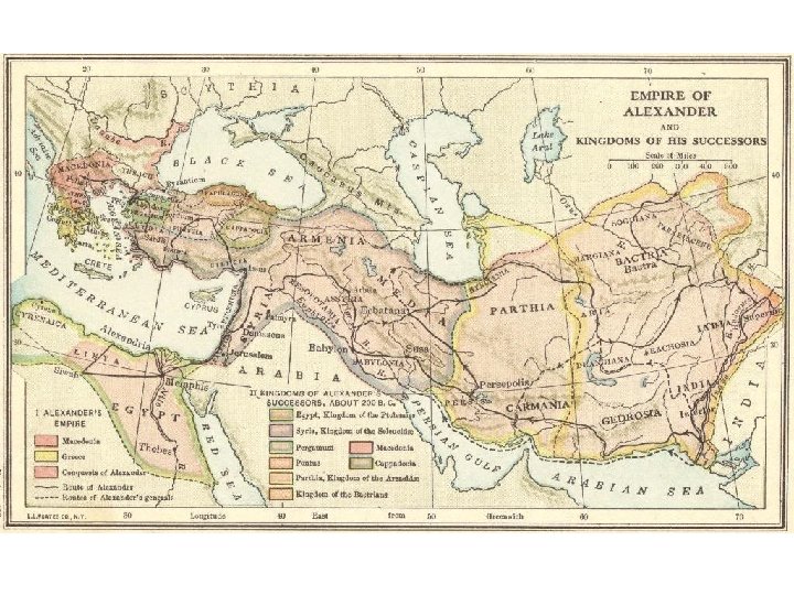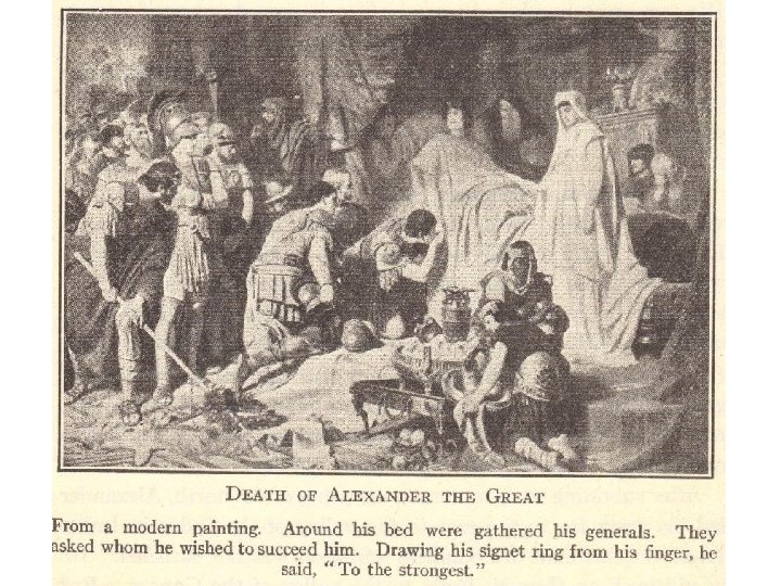 Alexander the Great • First put down local revolts, including destroying Thebes • Invasion of Persia and beyond – – – 35, 000 troops Granicus (334 B. C. E. ) Issus (333 B. C. E. ) Arbela (331 B. C. E. ) City-states along the Mediterranean • Phoenician Tyre – Egypt • Founded Alexandria – India • Reached Indus River – Set up capital in Babylon (located in modern-day Iraq) in 324 B. C. E. • Died of a fever in 323 B. C. E. at age 33