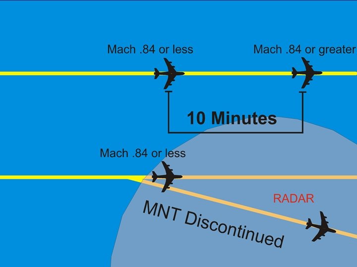 2. 5. 4. 2 “Rule of Thumb” for faster in back • “For each 600 NM in distance between the entry and exit points of the area where the MNT is used, add one minute for each 0. 01 difference in Mach number for the two aircraft concerned to compensate for the fact that the second aircraft is overtaking the first aircraft”