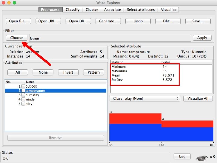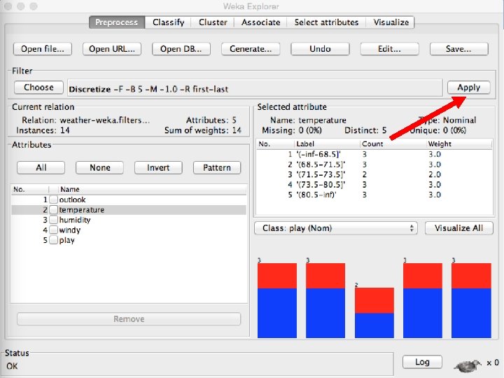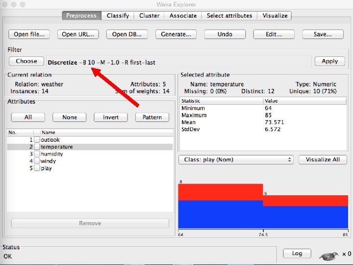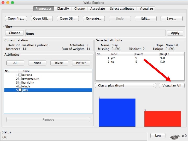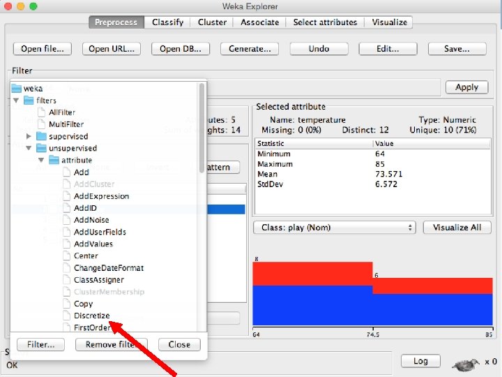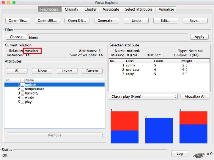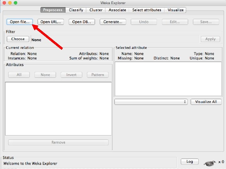 Explorer: pre-processing the data n Data can be imported from a file in various formats: ARFF, CSV, binary Data can also be read from a URL or from an SQL database (using JDBC) Pre-processing tools in WEKA are called “filters” n WEKA contains filters for: n n n Discretization, normalization, resampling, attribute selection, …