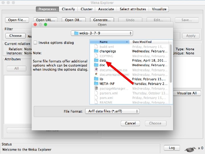 WEKA only deals with “flat” files @relation heart-disease-simplified @attribute age numeric @attribute sex { female, male} @attribute chest_pain_type { typ_angina, asympt, non_anginal, atyp_angina} @attribute cholesterol numeric @attribute exercise_induced_angina { no, yes} @attribute class { present, not_present} @data 63, male, typ_angina, 233, not_present 67, male, asympt, 286, yes, present 67, male, asympt, 229, yes, present 38, female, non_anginal, ? , not_present. . .