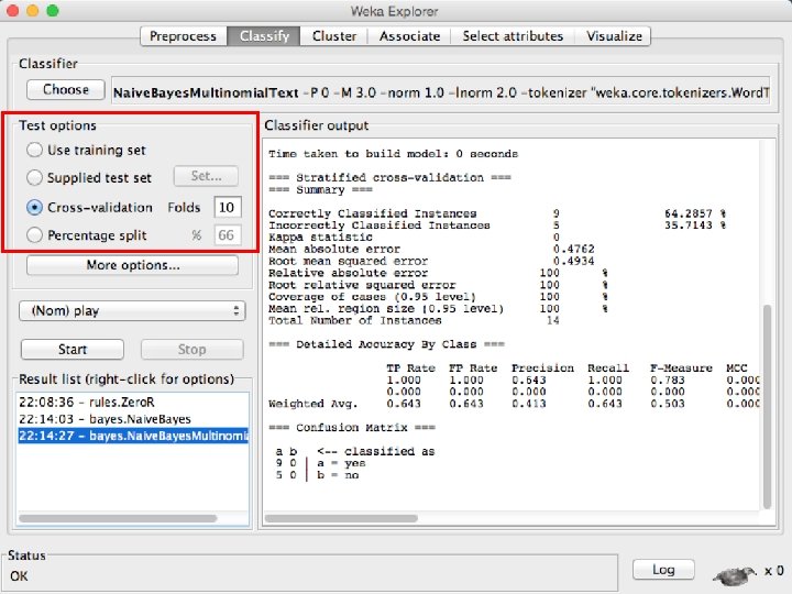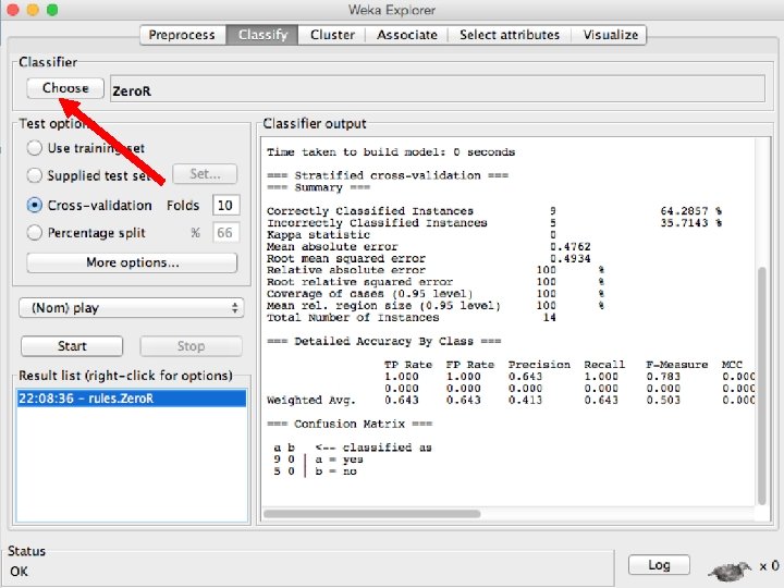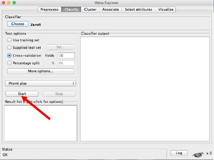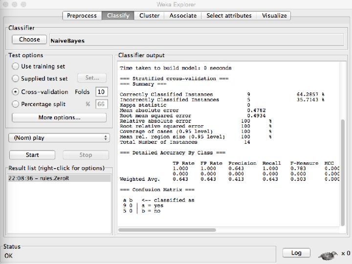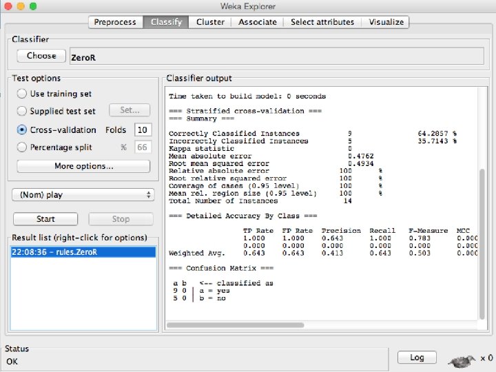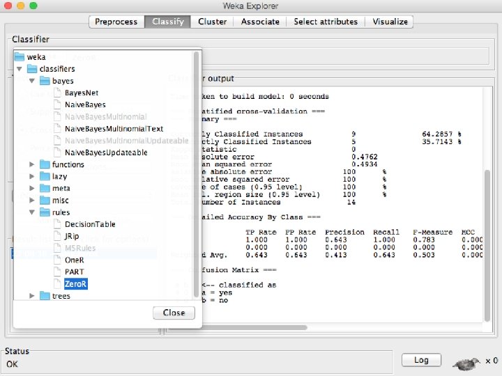 Explorer: building “classifiers” Classifiers in WEKA are models for predicting nominal or numeric quantities n Implemented learning schemes include: n n n Decision trees, support vector machines, perceptrons, neural networks, logistic regression, Bayes nets, … “Meta”-classifiers include: n Bagging, boosting, stacking, …