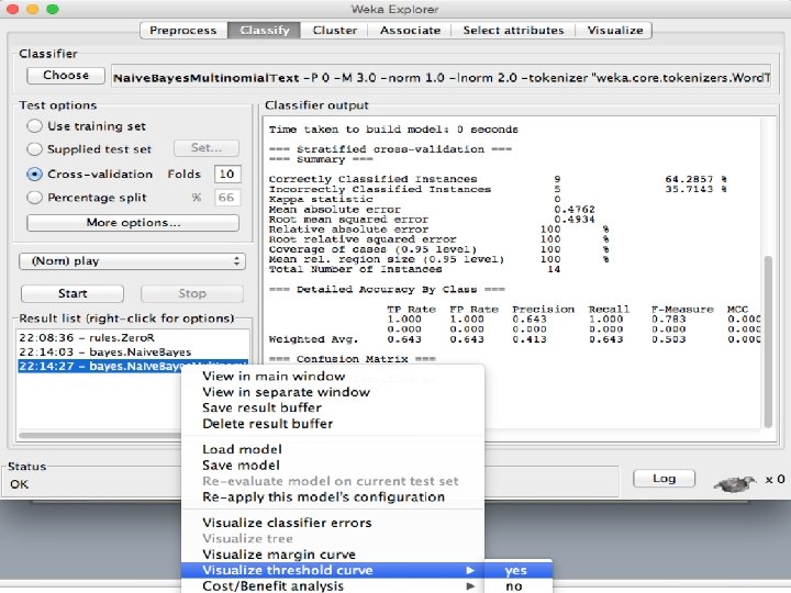 To Do Try Naïve Bayes and Logistic Regression classifiers on a different Weka dataset n Use various parameters n Try Linear regression n