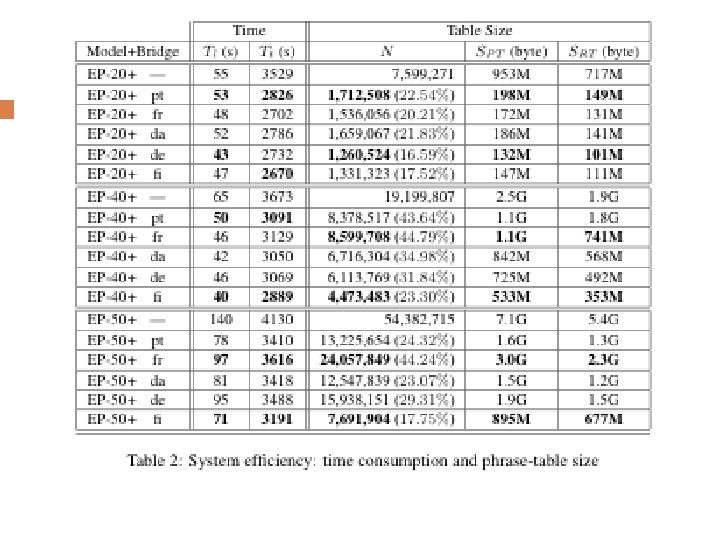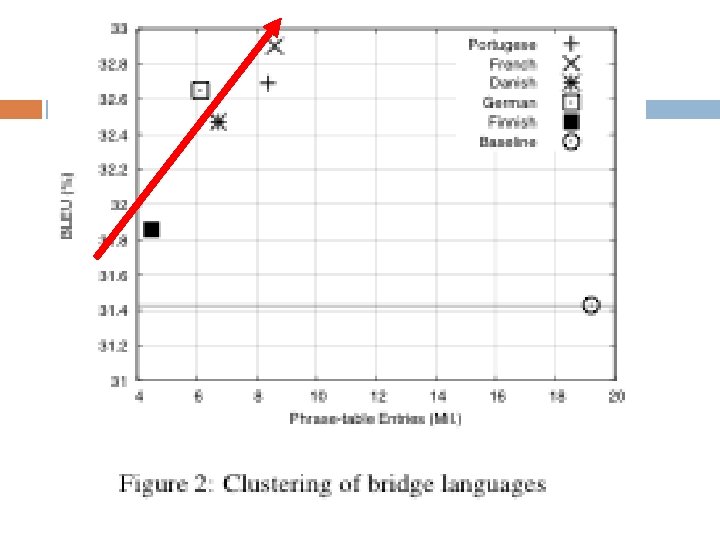 Experimental Design Database: Europarl (1. 3 million) Divided by maximal sentence length Spanish => English; bridges: French, Portuguese, Danish, German, Finnish Models from Moses toolkit Train, develop, test