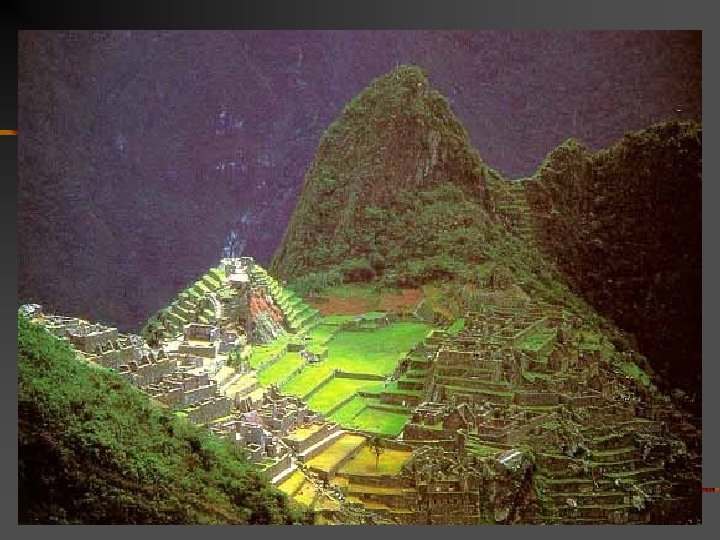 Introduction n n Machu Picchu was probably the most amazing urban creation of the Incan Empire, with its giant walls, terraces and ramps, which appear as though they have been cut naturally into the rock escarpments. This site was so well constructed that even after 5 centuries of neglect in the Peruvian jungle, only the thatch and reed roofs are missing.