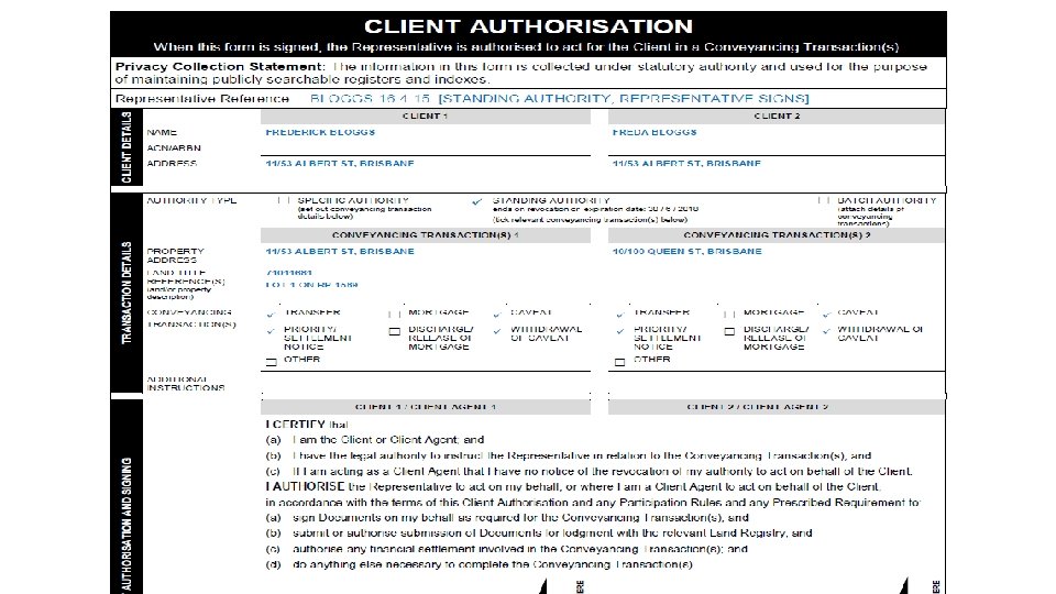 2. 5. 5 Managing transactional risks Electronic settlement using PEXA requires changes to current conveyancing practice. In particular solicitors will be required to take reasonable steps to verify the identity of their client and will be authorised to sign transfer documents and direct the payment of purchase money at settlement. Solicitors should consider how the necessary changes in conveyancing practice will be managed, including verification of identity of clients, notifications within the PEXA system or a workspace related to a transaction, new time limits for undertaking tasks, liability for stamp duty, checking for data entry mistakes, confirming accuracy of certifications at the time of signing instruments and ensuring compliance with time limits for exercising client rights prior to settlement. A summary of issues a law practice should give consideration to appear below and are expanded further where relevant in the Transaction Guidelines. a. Client authorisations and Verification of Identity A solicitor must obtain a Client Authorisation (see [3. 1]) prior to signing a document (except for a settlement notice and caveat) in PEXA. Prior to or at the time of obtaining a Client Authorisation, the solicitor must take reasonable steps to verify the identity of their client (QPR, clause 6. 5. 1). The Verification of Identity (VOI) Standard published by ARNECC Schedule 7 requires a face to face verification of identity and the production of certain original identity documents. A solicitor who complies with the VOI standard will be deemed to have taken reasonable steps in accordance with the QPR, clause 6. 5. 1. Compliance with the VOI Standard is not compulsory and solicitors will need to assess the risk of non-compliance in each case where the client is unable to provide appropriate identity documents or a face to face meeting is not possible. It may still be possible to take reasonable steps to identify the client even though the VOI Standard is not satisfied. (QPR, clause 6. 5. 2). Refer also to [3. 2]. A solicitor should note the obligation to undertake further investigation beyond the VOI Standard if an identity document is not genuine or a photograph is not a reasonable likeness or the person does not appear to be the person in the identity documents. (QPR, clause 6. 5. 3). 23 © Property Exchange Australia Limited (PEXA) 2017. QLS e-Conveyancing Guidelines – CAF & VOI REFERENCE Refer Page 10 of guide Refer to Electronic Conveyancing National Law(Queensland) 2013