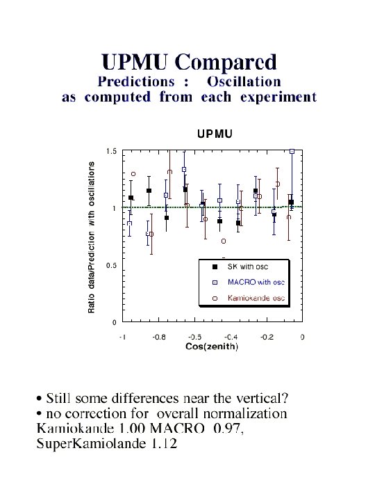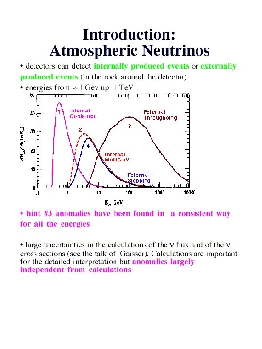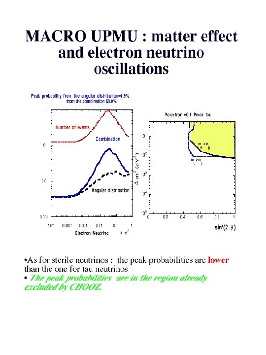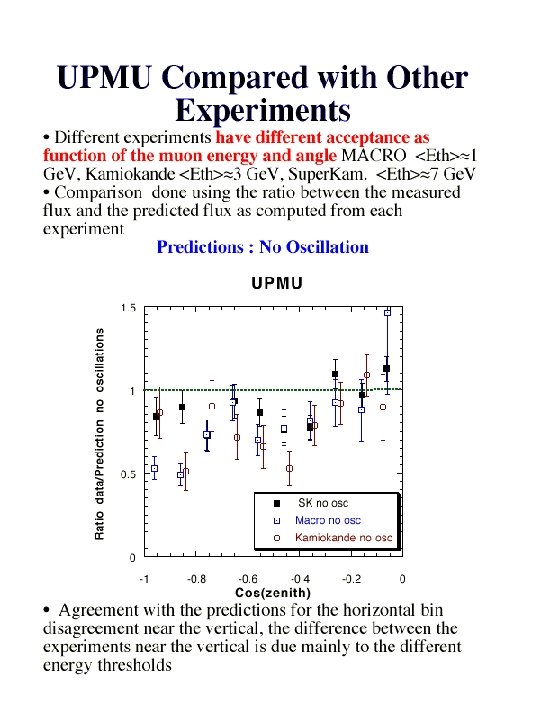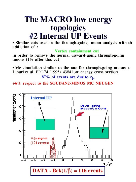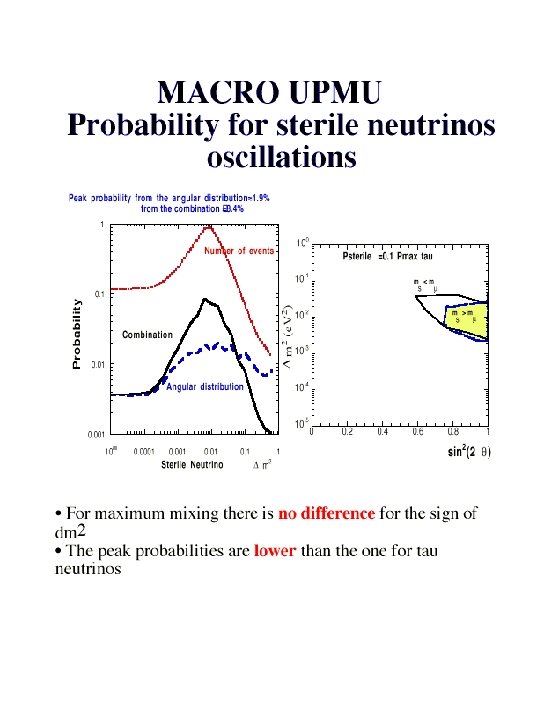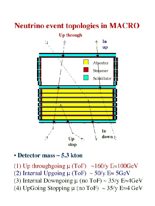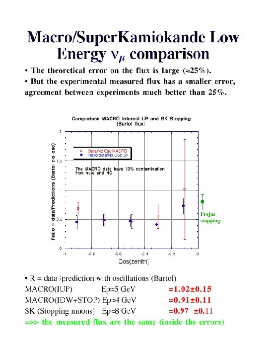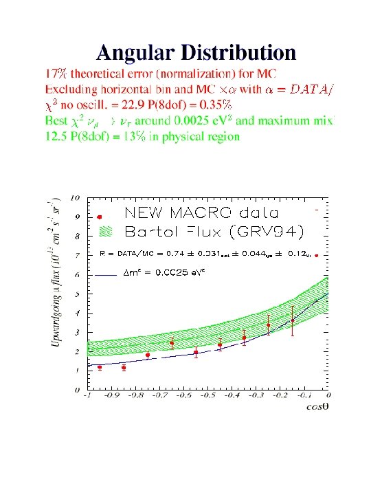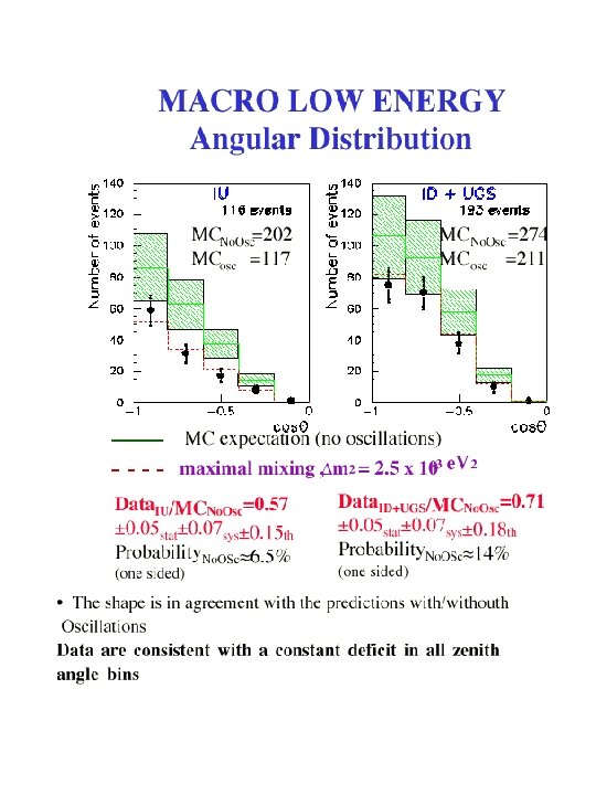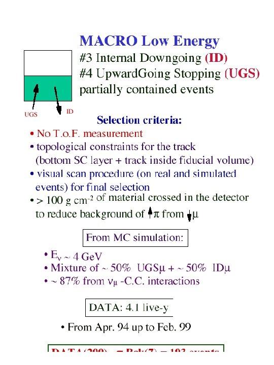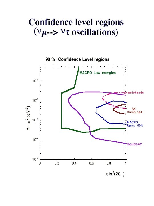 Conclusions § MACRO: !through-going muons : angular distribution more regular than in the past, !sterile neutrino disfavored at ~ 2 sigma !low energy events: 90% region of oscillation parameters in favor of oscillation § Super. Kamiokande SOUDAN 2 MACRO are consistent