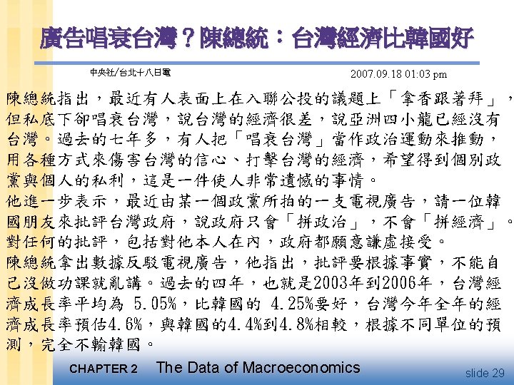 三、當前經濟發展情勢 q 2000~ 2002年我國的年平均經濟成長率較1996~ 1999年平均經 濟成長率衰退3. 27個百分點,台灣經濟的衰退率在亞洲各國中 高居第一。 單位:% 中 華 民 國 美 印 國 馬 來 西 亞 國 本 坡 國 港 尼 賓 1996 6. 10 3. 60 3. 50 8. 10 6. 80 4. 30 5. 90 10. 0 7. 80 5. 85 1997 6. 68 4. 40 1. 90 8. 50 5. 00 5. 10 -1. 37 7. 30 4. 70 5. 19 1998 4. 57 4. 30 -1. 1 -0. 9 -6. 7 -5. 0 -10. 51 -7. 4 -13. 1 -0. 59 1999 5. 42 4. 10 0. 20 6. 40 10. 9 3. 40 4. 43 6. 10 0. 80 3. 40 2000 5. 86 3. 80 2. 80 9. 40 9. 30 10. 2 4. 64 8. 50 4. 90 4. 38 2001 -2. 18 0. 30 0. 40 -2. 4 3. 10 0. 50 1. 90 0. 30 3. 50 4. 50 2002 3. 59 2. 40 0. 10 2. 20 6. 30 2. 30 5. 30 4. 10 3. 50 4. 40 1996~ 1999平均 A 5. 69 4. 10 1. 13 5. 52 4. 00 1. 95 -0. 39 4. 00 0. 05 3. 46 2000~ 2002平均 B 2. 42 2. 17 1. 10 3. 07 6. 23 4. 33 3. 91 4. 30 3. 97 4. 42 -3. 27 -1. 93 -0. 03 -2. 45 2. 23 2. 38 4. 30 0. 30 3. 92 0. 96 國 別 年 別 B-A 日 新 韓 香 泰 加 The Data of Macroeconomics CHAPTER 2 資料來源:依各國政府統計資料整理。 菲 律 slide 30