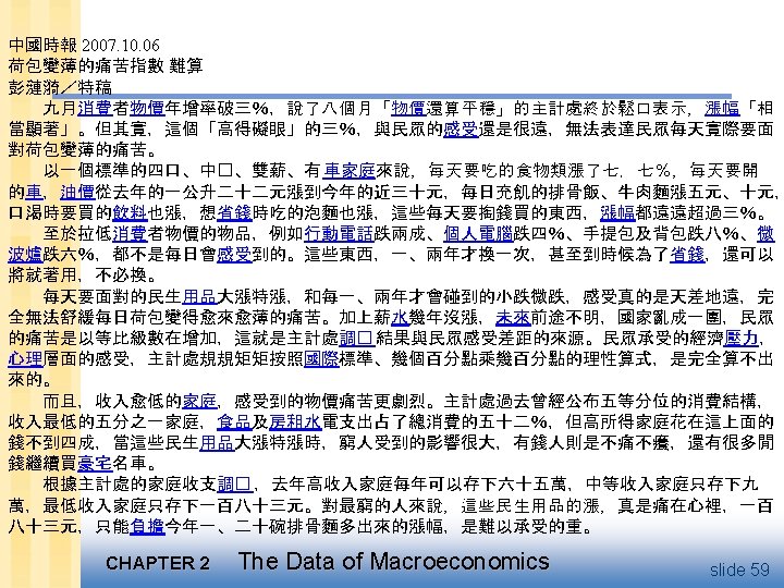 消 費 者 物 價 指 數 變 動 分 析 表 民國96年 7月 本月指數與各期比較 基期:民國90年=100 類 別 總指數 基 本 分 類 商 品 性 質 別 分 類 特分 殊類 權數 (‰) 本 指 月 數 與上月比較 (%) 對總指數影響 (百分點) 與上年同月比較 (%) 本年前7月指數平均 對總指數影響 與上年 12月比較(%) (百分點) 指數 與上年同期比較 (%) 對總指數影響 (百分點) 1000. 00 105. 01 -0. 24 -0. 34 0. 72 104. 43 0. 47 1、食物類 肉類 魚介 蔬菜 水果 250. 54 25. 17 16. 73 27. 89 27. 94 109. 61 114. 00 118. 09 119. 80 96. 15 -0. 94 -1. 09 0. 41 -6. 93 -5. 18 -0. 25 -0. 03 0. 01 -0. 24 -0. 14 -4. 79 1. 28 5. 48 -29. 07 -12. 68 -1. 32 0. 03 0. 10 -1. 30 -0. 37 -0. 79 0. 22 1. 48 -5. 04 -10. 77 -0. 21 0. 03 -0. 17 -0. 31 109. 30 114. 46 117. 94 112. 25 105. 88 -1. 57 -0. 26 6. 24 -7. 74 -10. 80 -0. 42 -0. 01 0. 11 -0. 25 -0. 35 2、衣著類 成衣 47. 46 32. 52 103. 73 101. 65 -3. 70 -4. 90 -0. 18 -0. 16 2. 51 3. 16 0. 11 0. 10 -3. 51 -5. 48 -0. 17 -0. 18 104. 30 102. 61 2. 08 2. 16 0. 10 0. 07 3、居住類 房租 家庭管理費用 水電燃氣 307. 94 210. 96 16. 20 37. 37 100. 23 97. 77 94. 72 115. 54 -0. 12 0. 01 -3. 81 0. 22 -0. 04 0. 00 -0. 06 0. 01 1. 06 0. 17 0. 71 4. 15 0. 31 0. 03 0. 01 0. 16 1. 24 0. 06 0. 70 7. 54 0. 36 0. 01 0. 29 99. 72 97. 70 100. 73 109. 92 1. 03 0. 18 -0. 53 4. 59 0. 30 0. 04 -0. 01 0. 17 4、交通類 油料費 交通服務費 126. 25 22. 63 77. 27 105. 96 149. 27 98. 24 1. 20 4. 29 0. 31 0. 15 0. 13 0. 02 0. 98 4. 14 0. 32 0. 13 0. 02 1. 87 6. 78 0. 55 0. 23 0. 21 0. 04 104. 24 139. 38 97. 98 1. 19 4. 29 0. 40 0. 15 0. 13 0. 03 37. 37 9. 19 120. 41 128. 39 0. 32 1. 23 0. 01 5. 04 21. 78 0. 20 4. 54 19. 30 0. 19 0. 18 117. 91 118. 40 3. 04 12. 55 0. 12 6、教養娛樂類 教養費用 娛樂費用 161. 11 118. 75 42. 36 99. 95 100. 67 98. 27 0. 57 0. 25 1. 54 0. 09 0. 03 0. 06 0. 88 0. 61 1. 67 0. 13 0. 07 0. 06 1. 26 0. 53 3. 40 0. 19 0. 06 0. 13 99. 41 100. 41 96. 94 0. 52 -0. 02 2. 06 0. 08 0. 00 0. 08 7、雜項類 香菸及檳榔 69. 33 19. 55 110. 99 147. 18 -0. 38 -1. 49 -0. 03 -0. 04 1. 33 2. 81 0. 10 0. 07 1. 63 2. 58 0. 12 0. 07 111. 38 148. 81 1. 92 4. 30 0. 14 0. 11 1、商品類 (不含食物) 非耐久性消費品 (不含食物) 半耐久性消費品 528. 52 277. 97 384. 36 133. 81 62. 59 81. 57 108. 01 106. 58 112. 99 119. 50 100. 85 88. 74 -0. 62 -0. 33 -0. 34 0. 71 -2. 94 -0. 22 -0. 34 -0. 09 -0. 14 0. 11 -0. 18 -0. 02 -1. 24 2. 32 -1. 76 3. 97 1. 85 -0. 80 -0. 68 0. 63 -0. 74 0. 58 0. 11 -0. 05 0. 61 1. 94 1. 35 5. 27 -3. 11 -0. 55 0. 33 0. 54 0. 56 0. 77 -0. 19 -0. 04 107. 07 105. 08 111. 52 115. 84 101. 31 89. 33 0. 35 2. 24 0. 29 3. 74 1. 55 -0. 29 0. 19 0. 61 0. 12 0. 54 0. 09 -0. 02 2、服務類 居住服務 交通服務 醫藥保健服務 教養娛樂服務 雜項服務 471. 48 237. 03 74. 10 24. 69 104. 85 30. 81 101. 63 97. 68 98. 09 121. 94 108. 22 100. 75 0. 22 -0. 26 0. 30 0. 00 1. 23 0. 01 0. 10 -0. 06 0. 02 0. 00 0. 13 0. 00 0. 75 0. 28 0. 27 0. 26 2. 32 0. 26 0. 34 0. 06 0. 02 0. 01 0. 25 0. 01 0. 83 0. 14 0. 51 0. 16 2. 73 0. 63 0. 38 0. 03 0. 04 0. 00 0. 29 0. 02 101. 46 98. 03 97. 84 121. 88 106. 79 100. 96 0. 61 0. 20 0. 36 0. 45 1. 70 0. 55 0. 28 0. 05 0. 02 0. 01 0. 18 0. 02 總指數(不含蔬菜水果) 總指數(不含食物) 944. 17 749. 46 104. 91 103. 47 0. 14 0. 00 0. 13 0. 00 1. 44 1. 33 0. 97 1. 28 1. 25 1. 20 0. 92 104. 23 102. 81 1. 15 1. 22 1. 07 0. 89 總指數(不含蔬果魚介及能源) 873. 10 103. 02 -0. 02 1. 11 0. 94 0. 77 0. 66 102. 80 0. 77 0. 66 5、醫藥保健類 藥品及保健食品 說明:由於受查者延誤或更正報價,本表所載資料於公布 後3個月內均可能修正。 CHAPTER 2 The Data of Macroeconomics slide 55