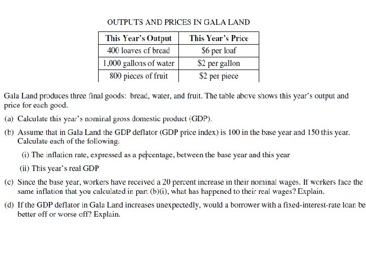 Practice Year 1 2 3 4 5 Nominal, Units of Price GDP Output Per Unit 5 10 20 40 50 Real, GDP Consumer Price Index (Year 3 as Base Year) $6 8 10 12 14 Make year three the base year CPI = Price of market basket in the particular year Price of the same market basket in base year x 100