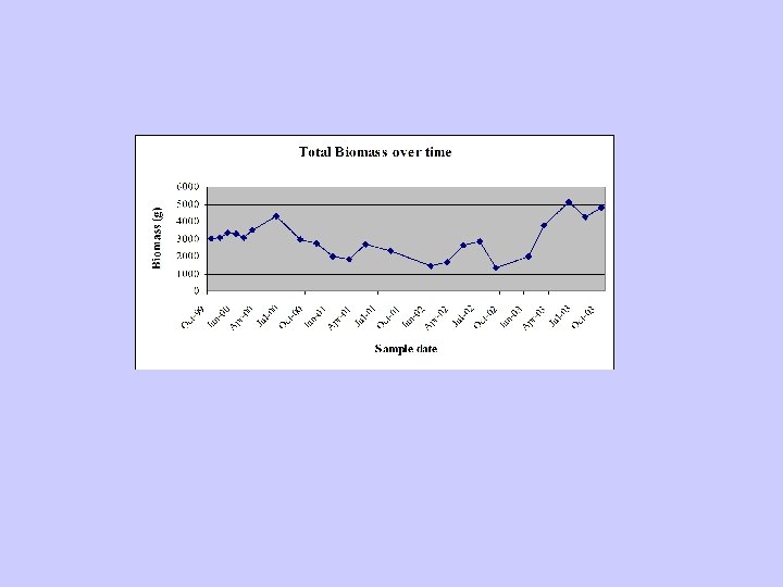 Shannon-Weiner Diversity Indices Oct 1999 Nov 1999 Dec 1999 Jan 2000 Feb 2000 Mar 2000 Jun 2000 Sep 2000 Nov 2000 Jan 2001 Mar 2001 Aug 2001 0. 55 0. 58 0. 55 0. 51 0. 45 0. 42 0. 47 0. 43 0. 52 0. 66 0. 64 0. 59 Jan 2002 Mar 2002 May 2002 Jul 2002 Sep 2002 Jan 2003 Mar 2003 June 2003 Aug 2003 Oct 2003 0. 59 0. 56 0. 55 0. 62 0. 50 0. 63 0. 65 1. 21 1. 08 0. 97