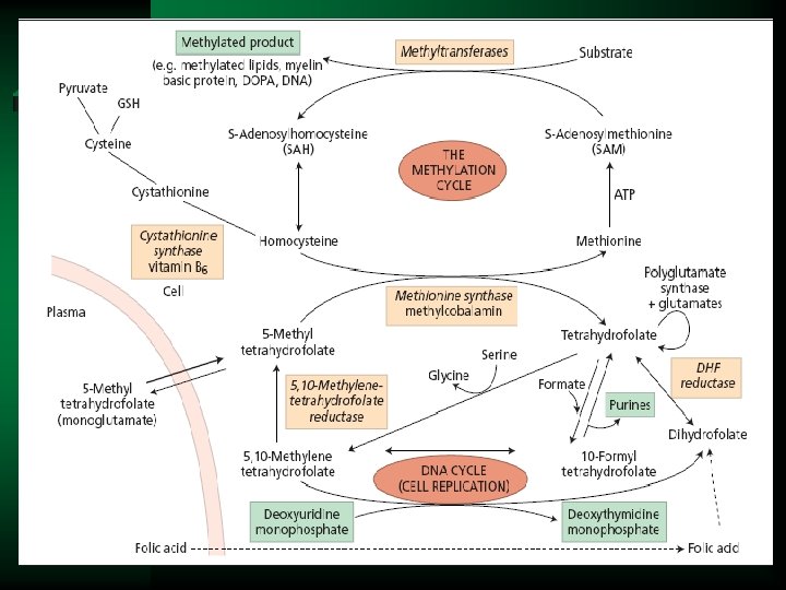 Folate deficiency Ú Dietary sources – Present in animal and vegetable products • Asparagus, broccoli, spinach, lettuce, lima beans (>1 mg/100 g dry weight) • Liver, yeast, mushrooms, oranges • Cooking depletes food of folate Ú Metabolism – Absorbed most actively in the jejunum and upper ileum Ú Body stores are 5 -10 mg (liver) – Minimal daily intake is 50 micrograms • Higher for pregnancy and lactation – Folate deficiency can lead to birth defects (neural tube defects) – If intake is reduced to 5 micrograms/day, megaloblastic anemia will develop in ~4 months