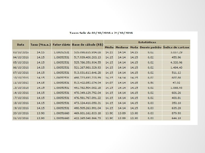 SELIC – taxa over • Instituições financeiras emprestam dinheiro umas as outras, dando como garantia seus títulos públicos • A média dessas operações nos oferece a taxa Selic Over
