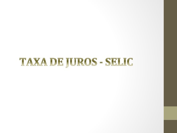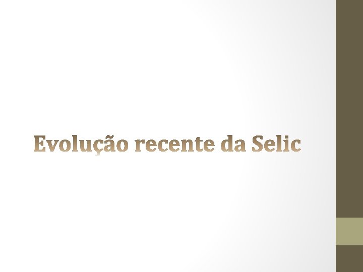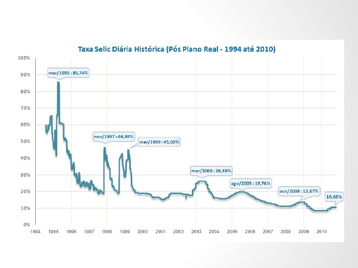 SELIC – taxa meta • Definida nas 8 reuniões anuais do COPOM • Instrumento de política monetária • O BACEN deve fazer de tudo para que os títulos negociados na SELIC fiquem nesse patamar (comprando e vendendo títulos)