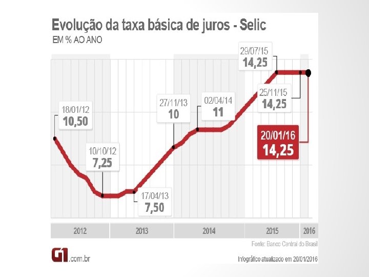 SELIC - funcionamento • Governo precisa de dinheiro (além dos tributos) para fechar suas contas • Emite título público para emprestar dinheiro de terceiros • O maior montante é comprado por instituições financeiras