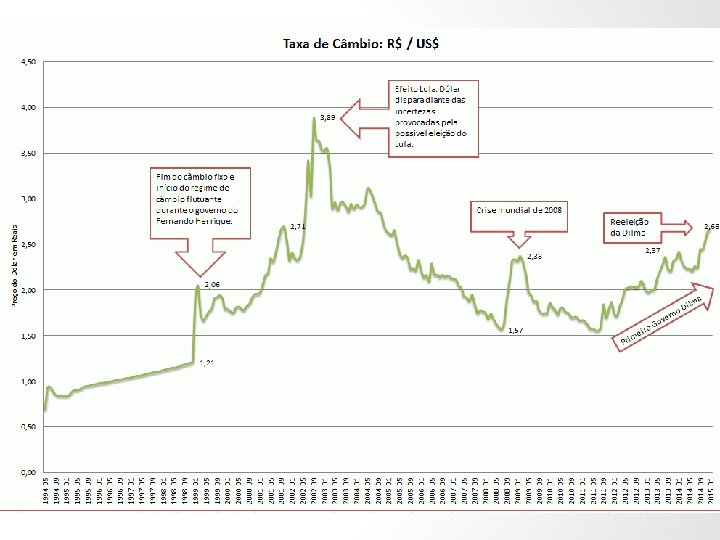 Taxa de câmbio alta ou baixa • Exemplo do câmbio em DÓLAR • O costume é expressarmos a taxa de câmbio como: R$/US$ • Dessa forma, uma taxa de R$4, 00/dólar é mais alta do que R$2, 00/dólar • No primeiro caso, o real está desvalorizado, enquanto no segundo, valorizado