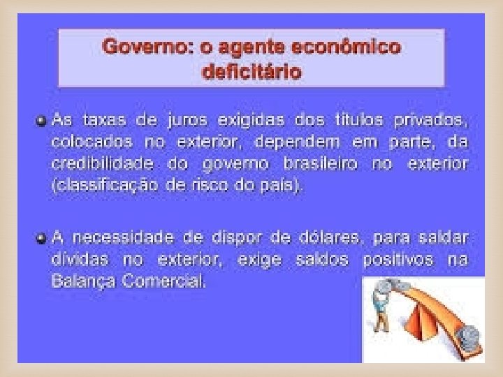 Equilíbrio Externo Déficit externo mais forte, implica em perda de reservas, o que pode levar a uma moratória; Superávit externo mais prolongado, o governo deve emitir moeda gerando inflação ou expansão da dívida interna (Risco). Distribuição Eqüitativa de Renda - política de longo prazo; - aumento do poder de compra das classes mais baixas; - desenvolvimento econômico.