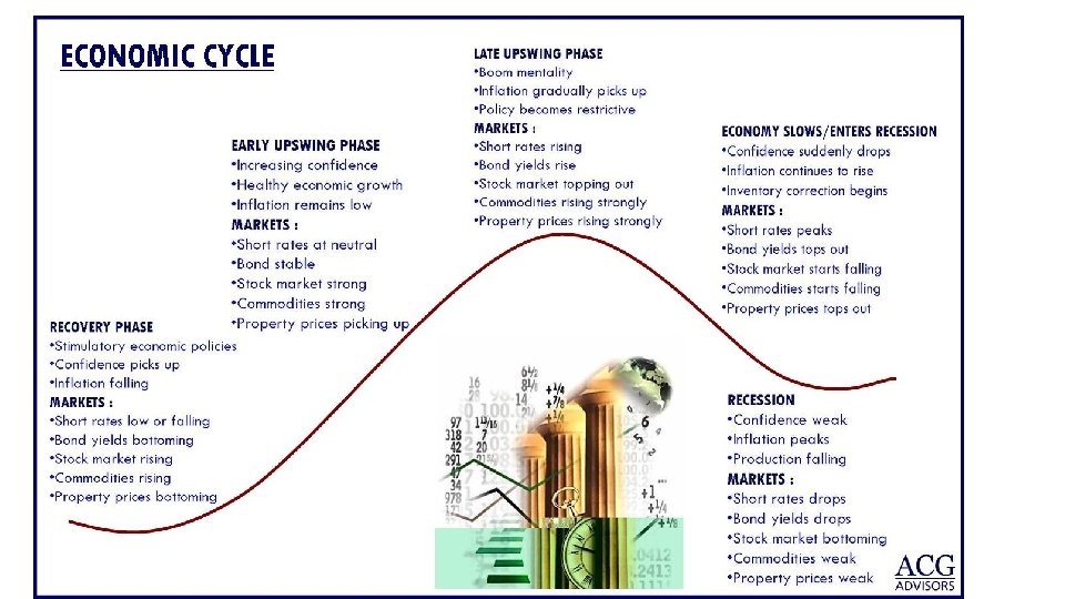 Business cycles and investment decisions The business cycle is a long-term pattern of changes in Gross Domestic Product (GDP) that follows four stages: expansion, prosperity, contraction, and recession. The phases of the business cycle are characterized by changing employment, industrial productivity, and interest rates. As a result the economic cycle provides the strategic framework for economic activity and investing. The business cycle affects employees, employers and investors.