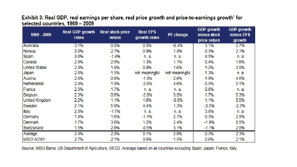 Conclusions of analysis MSCI Barra Research We may intuitively think of stock returns as a result of the underlying real economy growth. However, long term real earnings growth fell behind long term GDP growth in many countries. Several factors may explain this discrepancy: • in today’s integrated world we need to look at global rather than local markets. • a significant part of economic growth comes from new enterprises and not the high growth of existing ones; this leads to a dilution of GDP growth before it reaches shareholders. • expected economic growth may be built into the prices and thus reduce future realized returns.