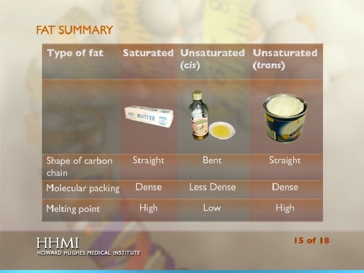 Saturated vs Unsaturated SATURATED UNSATURATED (cis) UNSATURATED (trans) COMPLETELY FULL OF HYDROGEN NOT FULL OF HYDROGEN CHEM. PROCESS TO ADD IN MORE HYDROGEN “HYDROGENATED” ALL SINGLE BONDS IN F. A DOUBLE BONDS IN F. A. STRAIGHT TAIL BENT TAIL STRAIGHT TAIL DENSLEY PACKED TAIL LESS DENSLY PACKED TAIL DENSE PACKED SOLID AT ROOM TEMP LIQUID AT ROOM TEMP SEMI-SOLID AT ROOM TEMP EX: BUTTER EX: OLIVE OIL EX: CRISCO