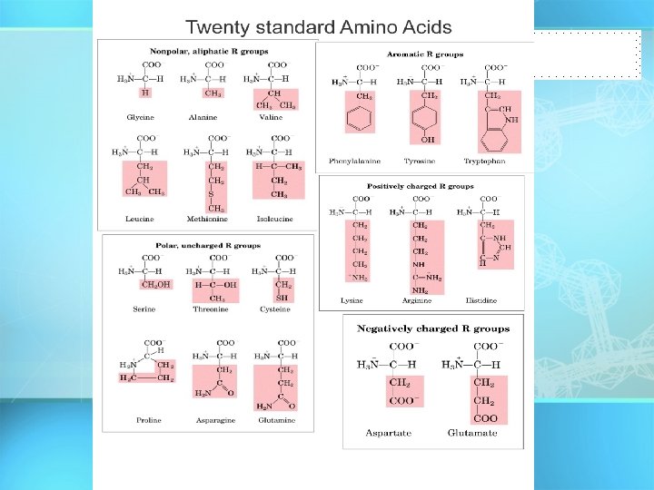 Proteins (Polypeptides) • Building Blocks: AMINO ACIDS – 20 different Amino Acids – Same structure except for R group • Amino Acids – – Carboxylic Acid Group Amino Group R group (variable) Central Carbon Carboxylic Acid Group