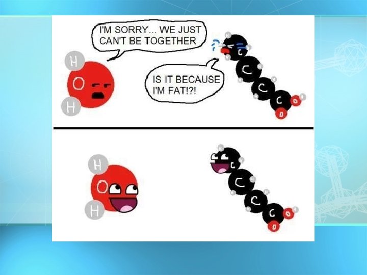 Phospholipids they make up cell membrane (lipid tails + glycerol/phosphate head) Polar Head Hydrophilic- LOVES water Non-Polar Head Hydrophobic- HATES water