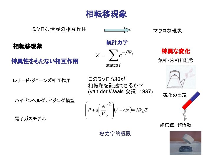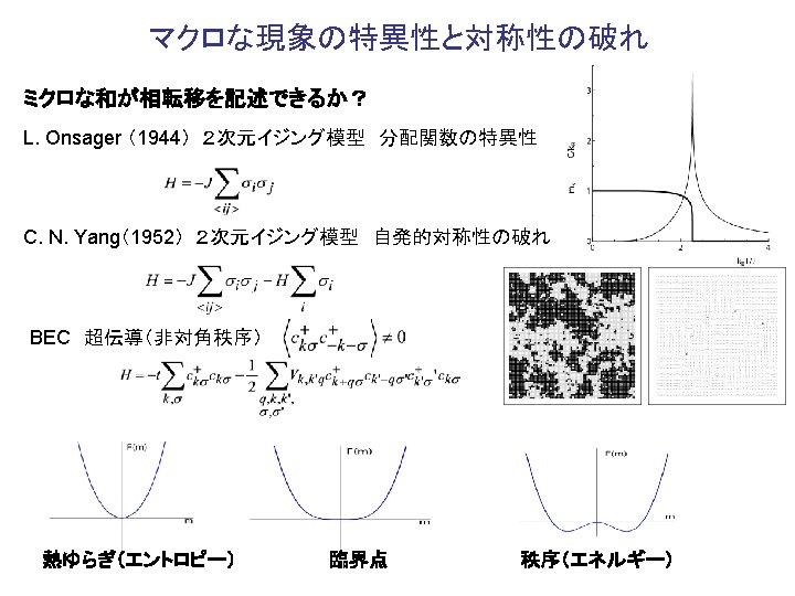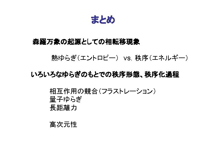 長距離相互作用 スピンクロスオーバー相転移 構成ユニット(分子)の体積の状態依存性 実効的長距離相互作用 示量性の破れと境界条件 M. Nishino, K. Boukheddaden, Y. Konishi and SM: PRL 98 (2007), 247203. Y Konishi, H. Tokoro, M. Nishino and SM: PRL. 100, (2008)067206. SM, Y. Konishi, M. Nishino, H. Tokoro and P. A. Rikvold. PRB 77, (2008) 0144105. SM, P. A. Rikvold , T. Mori, Y. Konishi, M. Nishino and H. Tokoro: PRB 80, (2009) 064414. 金属表面への 吸着 S. Furuya, S. Tsuneyuki, Y. Yoshimoto