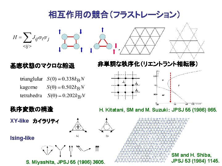 Macroscopic degeneracy in corner-sharing lattices Macroscopic degenerate ground state 3 D corner sharing lattice with global 2 -fold degeneracy Spin ice Order by disorder (entropy induced order) A. Kuroda and SM, JPSJ 64 (1995) 3688. S. Tanaka and SM: JPSJ 76 (2007) 103001. Dy 2 Ti 2 O 7 T. Sakakibara, T. Yayama, Z. Hiroi, K. Matsuhira and S. Takagi: PRL 90 (2003) 207205.