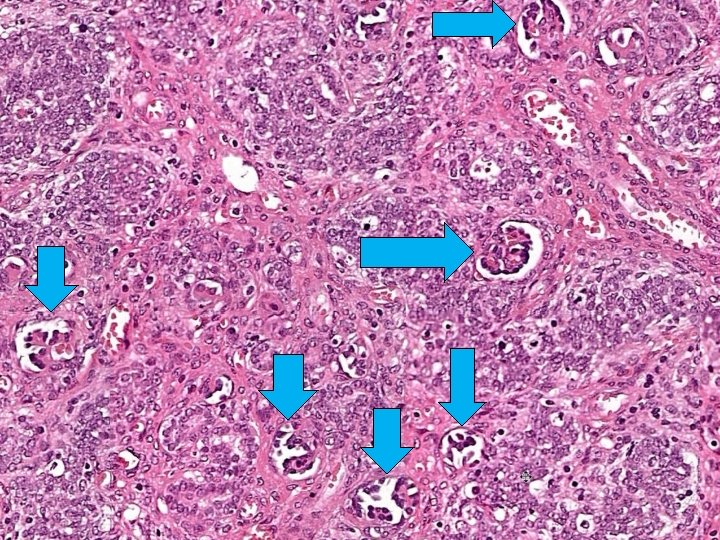 Pathology of Wilms Tumor • Gross – well circumscribed fleshy tan tumor – areas of hemorrhage and necrosis • Microscopic: triphasic appearance – Blastema: small blue cells – Epithelial elements: tubules & glomeruli – Stromal elements • Anaplasia – correlates with p 53 mutation and poor prognosis and resistance to chemotherapy